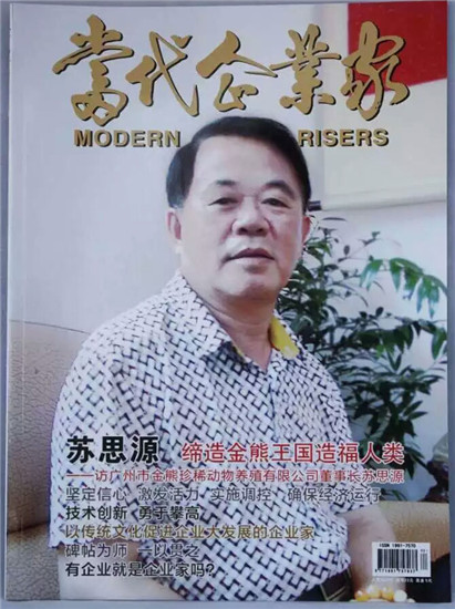 2014年8月,广州市金熊珍稀动物养殖有限公司董事长苏思源先生接受《当代企业家》杂志采访,并荣登当期杂志封面人物。《当代企业家》杂志专题报道了苏思源先生作为特种养殖行业的领航者,坚持科学的救护、繁养、驯化、善待国家濒危珍稀野生动物,有效地利用金熊珍稀动物的熊胆资源,历经数十年呕心沥血、潜心研究,合理地开发了6个系列的熊胆产品,支持中医药科学发展,为大众健康贡献心力的事迹。